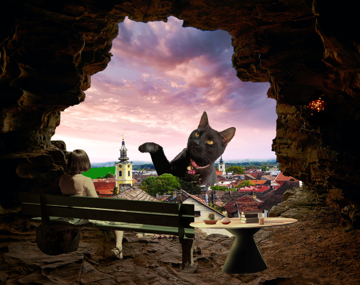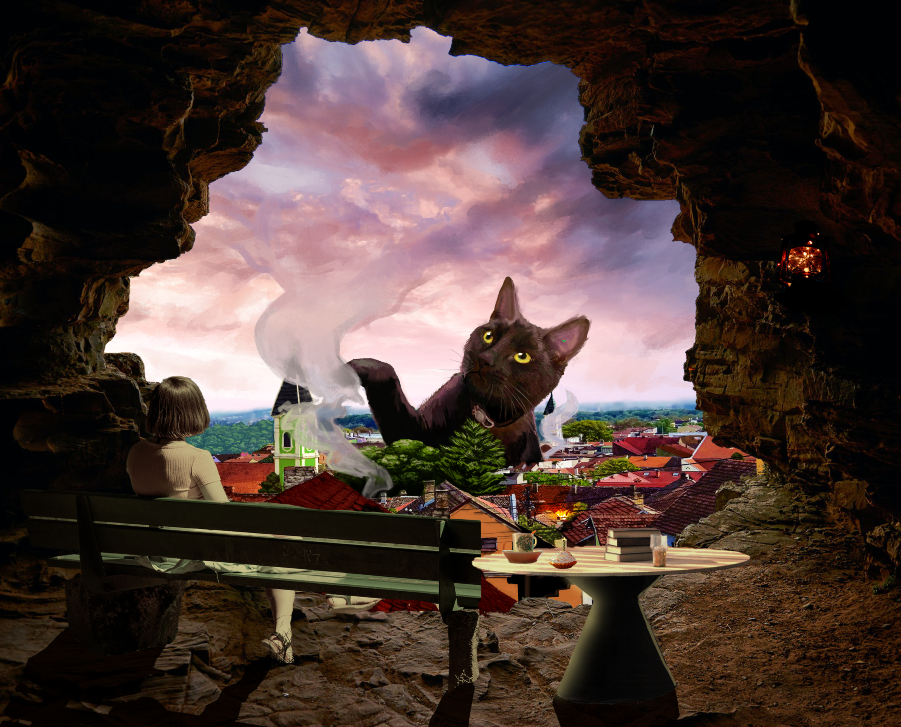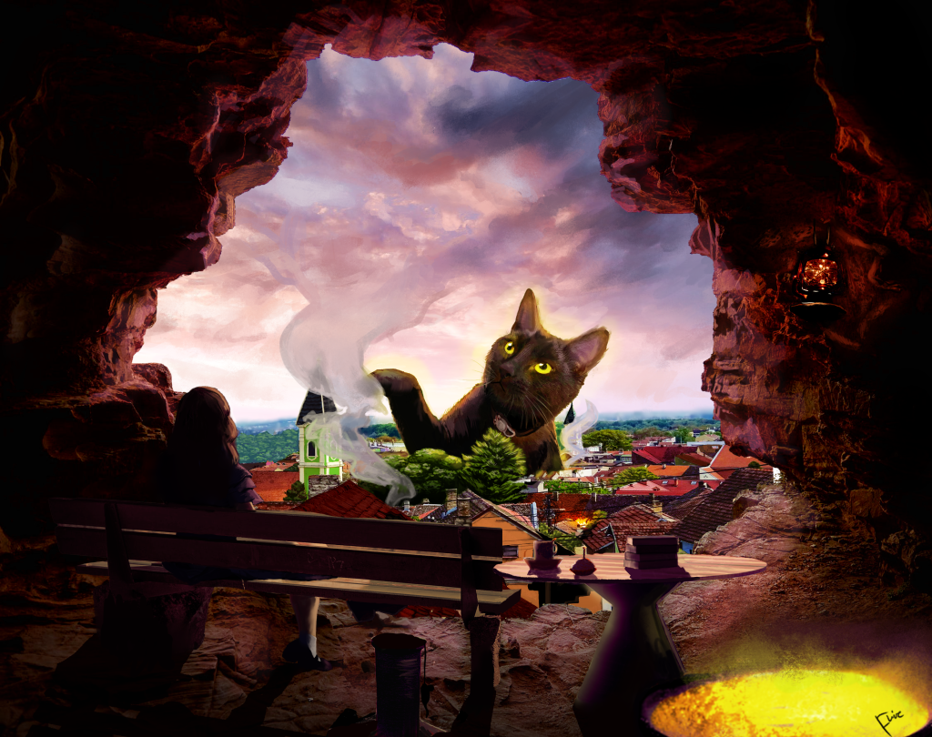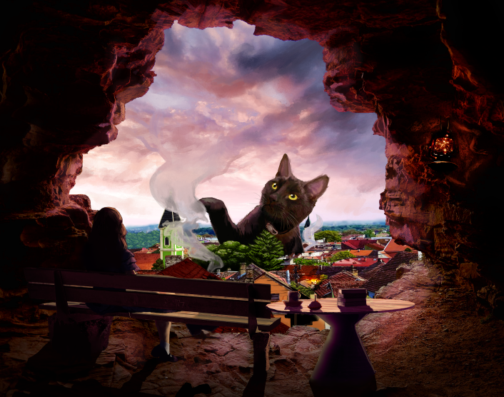 The above picture is when I added all the photos and did a quick colour match, bringing it to warm colour tones. I was focusing on it appearing like the villainous witch character was watching from a more homely cave while their Cat monster attacked the city.