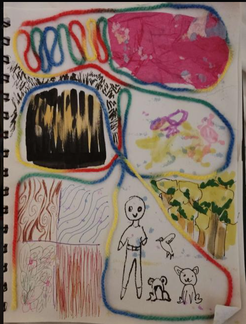 I stucked colourful yarn from a leftover cortchet project, tissue paper from packaging, then also did some weird techniques like trying differnet brush strokes and also splashing water on a bit of the page then tracing over the splash in marker and doing that several times for layered colours.